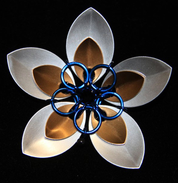 Published May 8, 2014 at 595 × 613 in Cin’s Chainmail Curios 2LayerFlower1 2 layer flower, silver and brown scales with blue rings Like Loading... ← Previous Next →