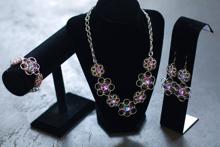 Published January 4, 2018 at 2816 × 1880 P1310300 Aluminium rings and Swarovski crystals. Earrings, bracelet and necklace set.