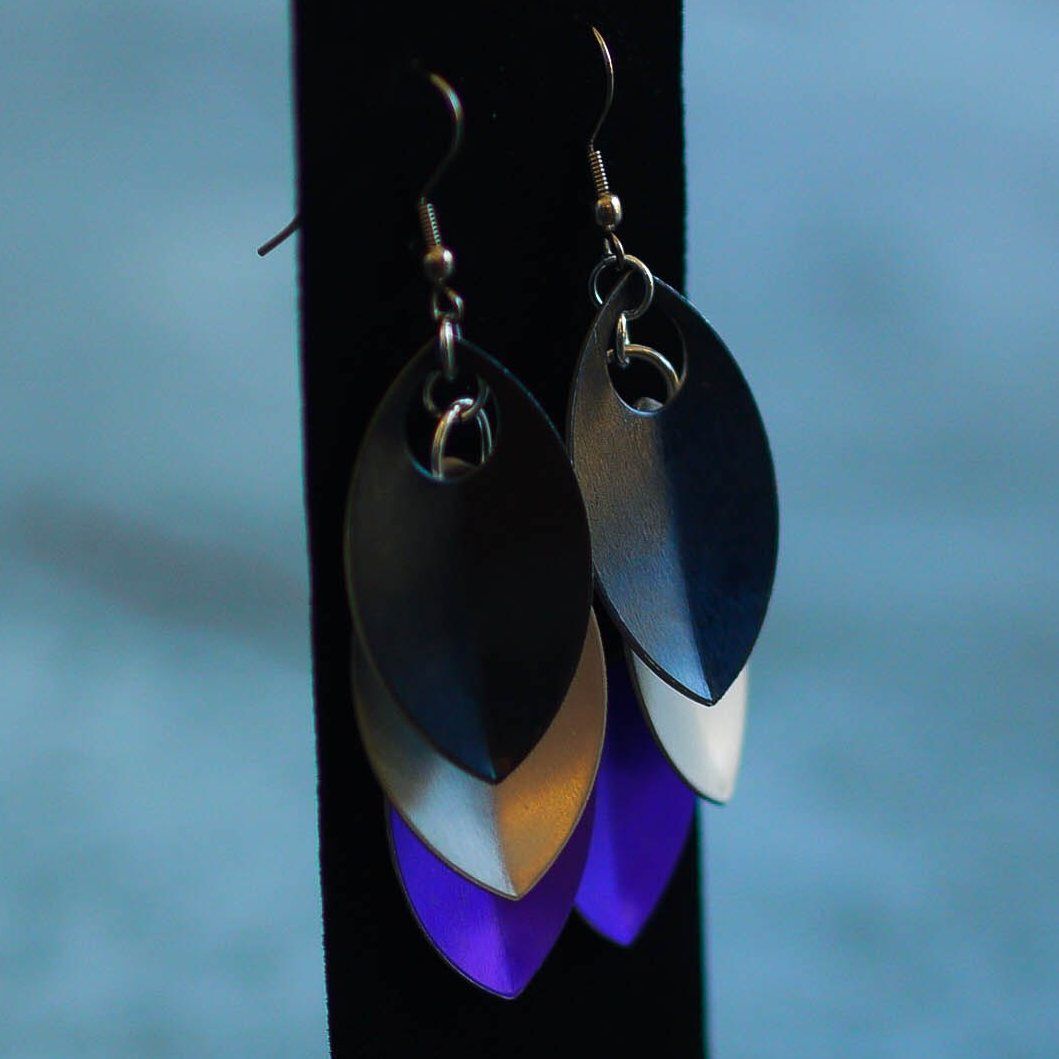 Small black, silver and purple aluminium scales