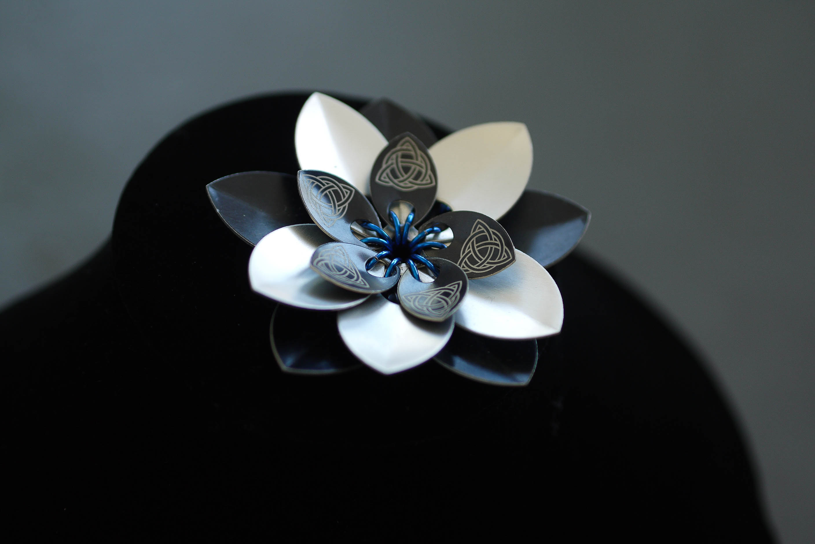 Published January 4, 2018 at 2816 × 1880 P1310444 3 layer flower, black and silver with blue rings, aluminium